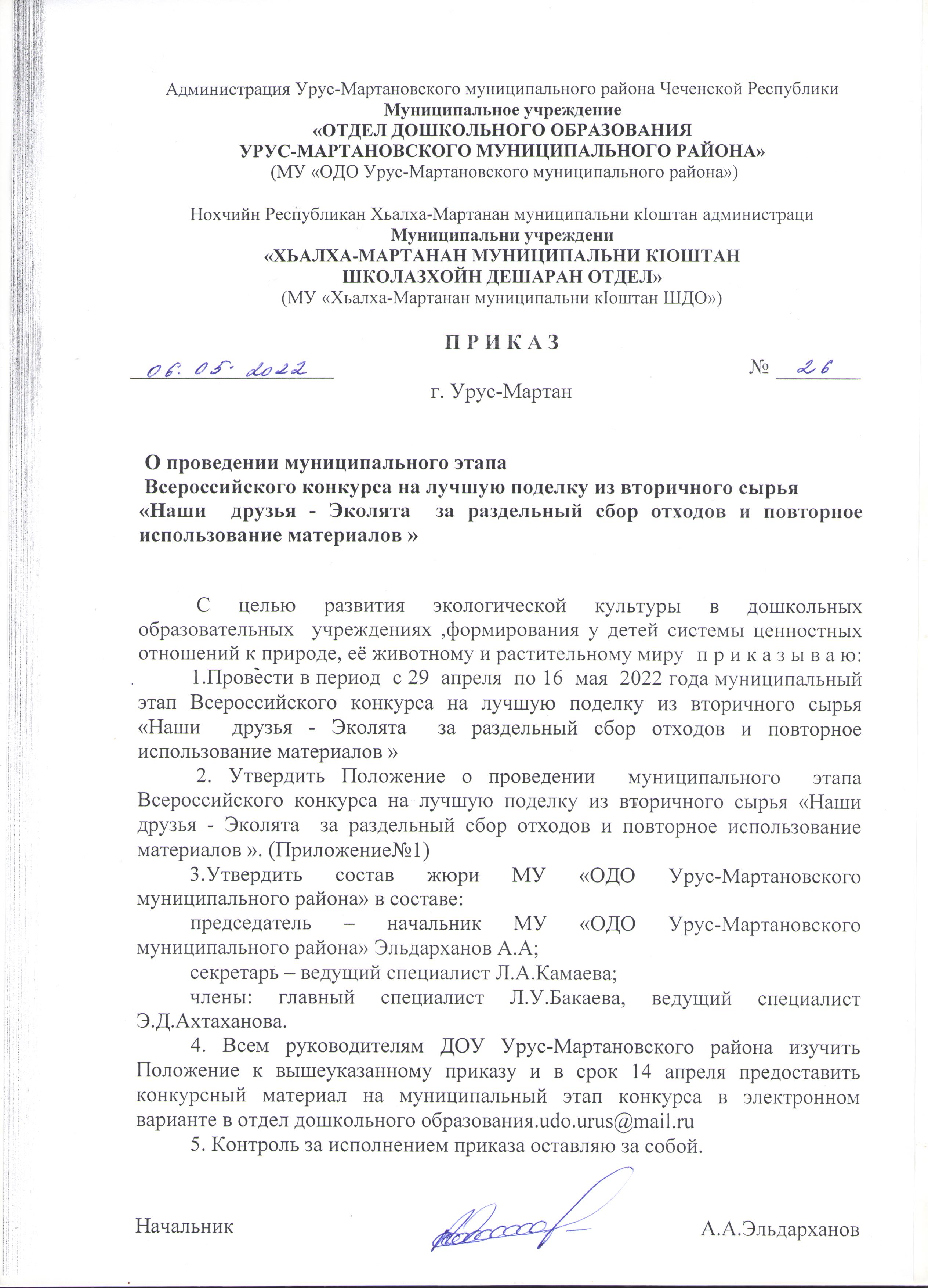 Приказ об утверждении Порядка предоставления учредителю отчета о результатах самообследования муниципальных бюджетных дошкольных образовательных учреждений Урус-Мартановского муниципального района