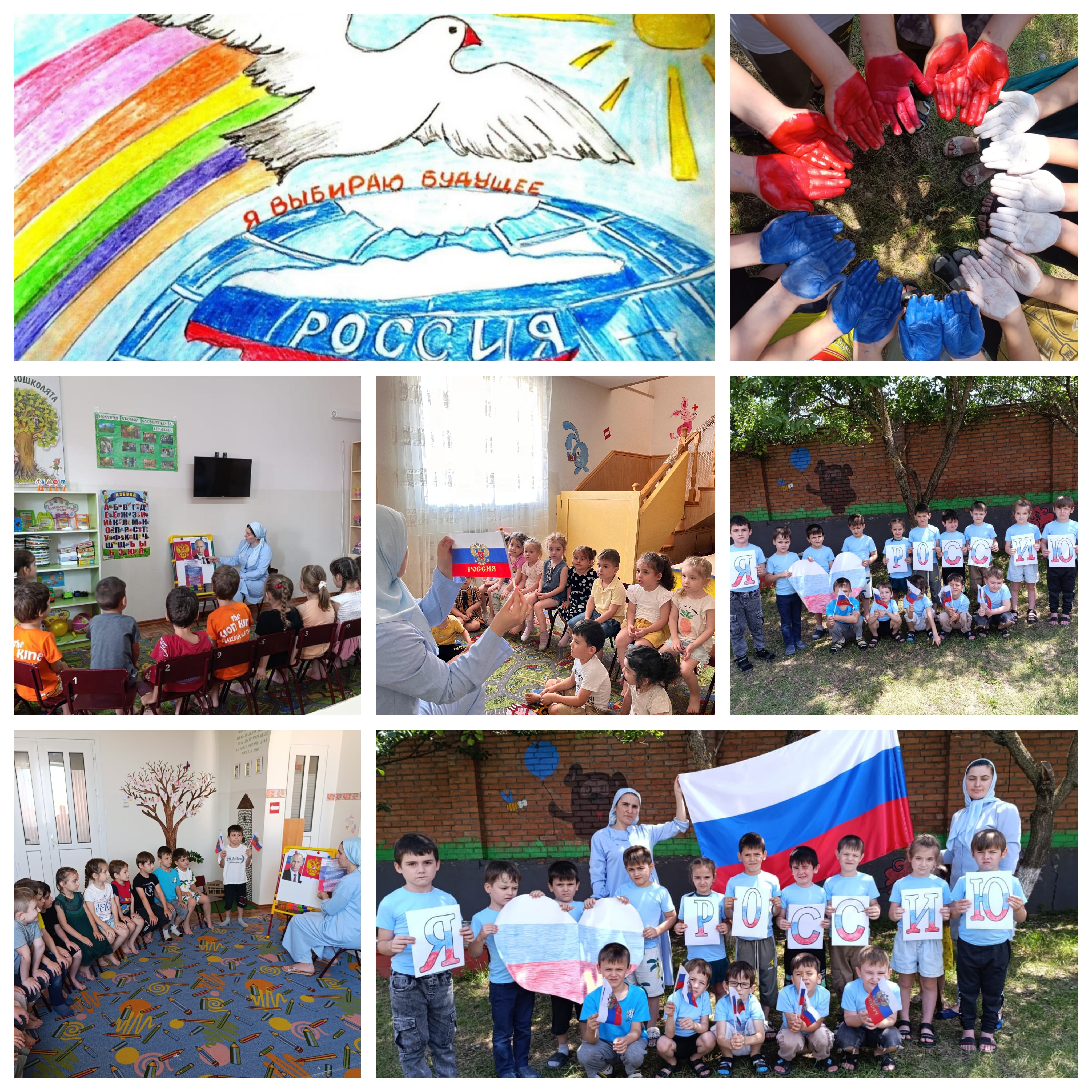 В нашем дошкольном учреждении проводились беседы, в которой ребятам было рассказано, что Россия свободная страна, в которой проживают разные народности в мире и согласии. О ценностях нашего народа, о традициях русского народа. Было рассказано о символах нашей страны. Почему наш флаг состоит из трех цветов, и что обозначает каждый цвет.