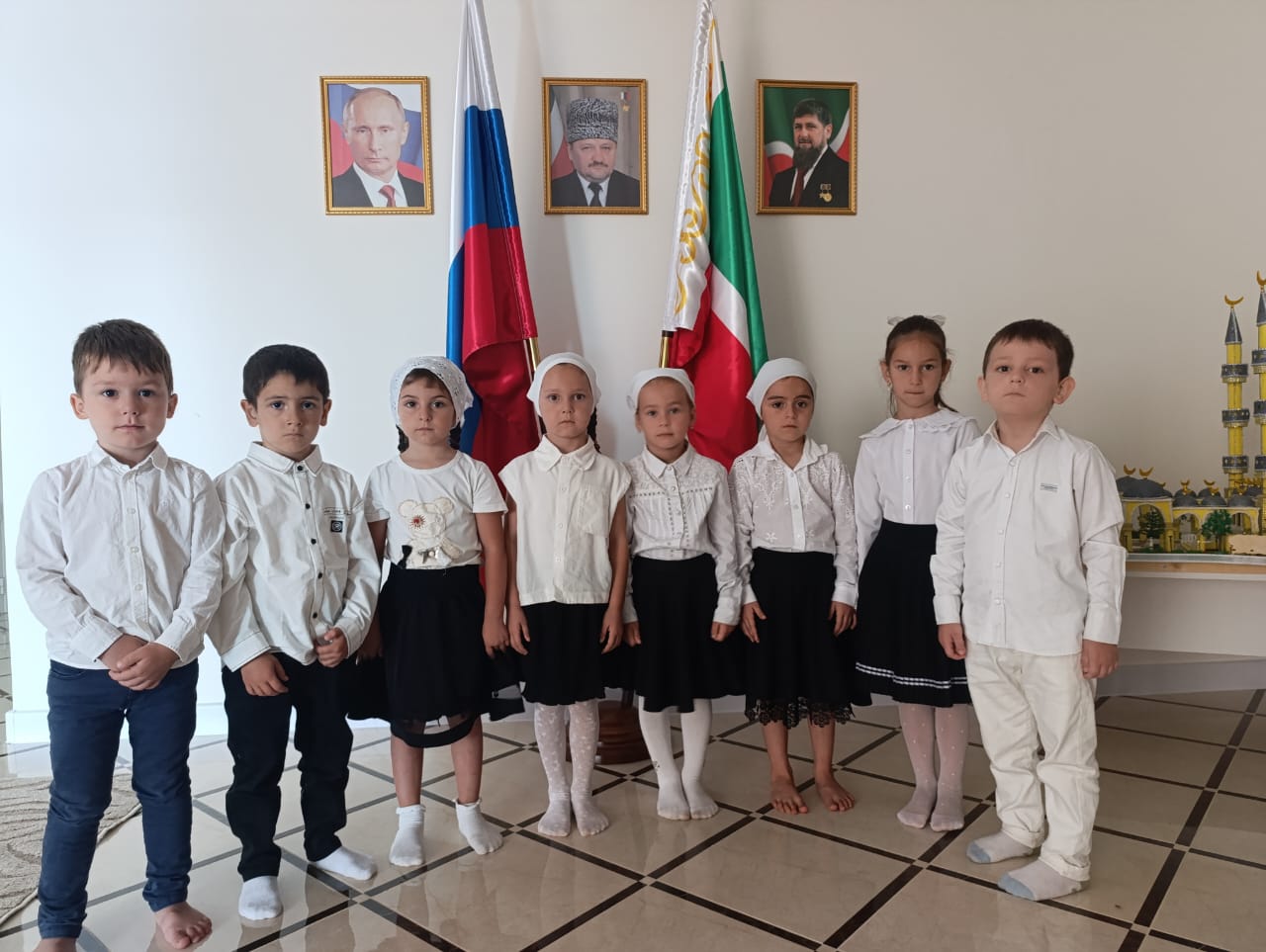 Утренний прием детей проводился под Гимн ЧР, песни и беседы, посвящен-ные Первому президенту ЧР. Дети пели, читали стихи, высказывали слова благо-дарности человеку, который подарил им это счастливое детство. Время бежит вперед. И только по его истечении осознаешь заслуги этого человека перед своим народом, который сделал все, чтобы воцарились мир и согласие на чеченской земле.