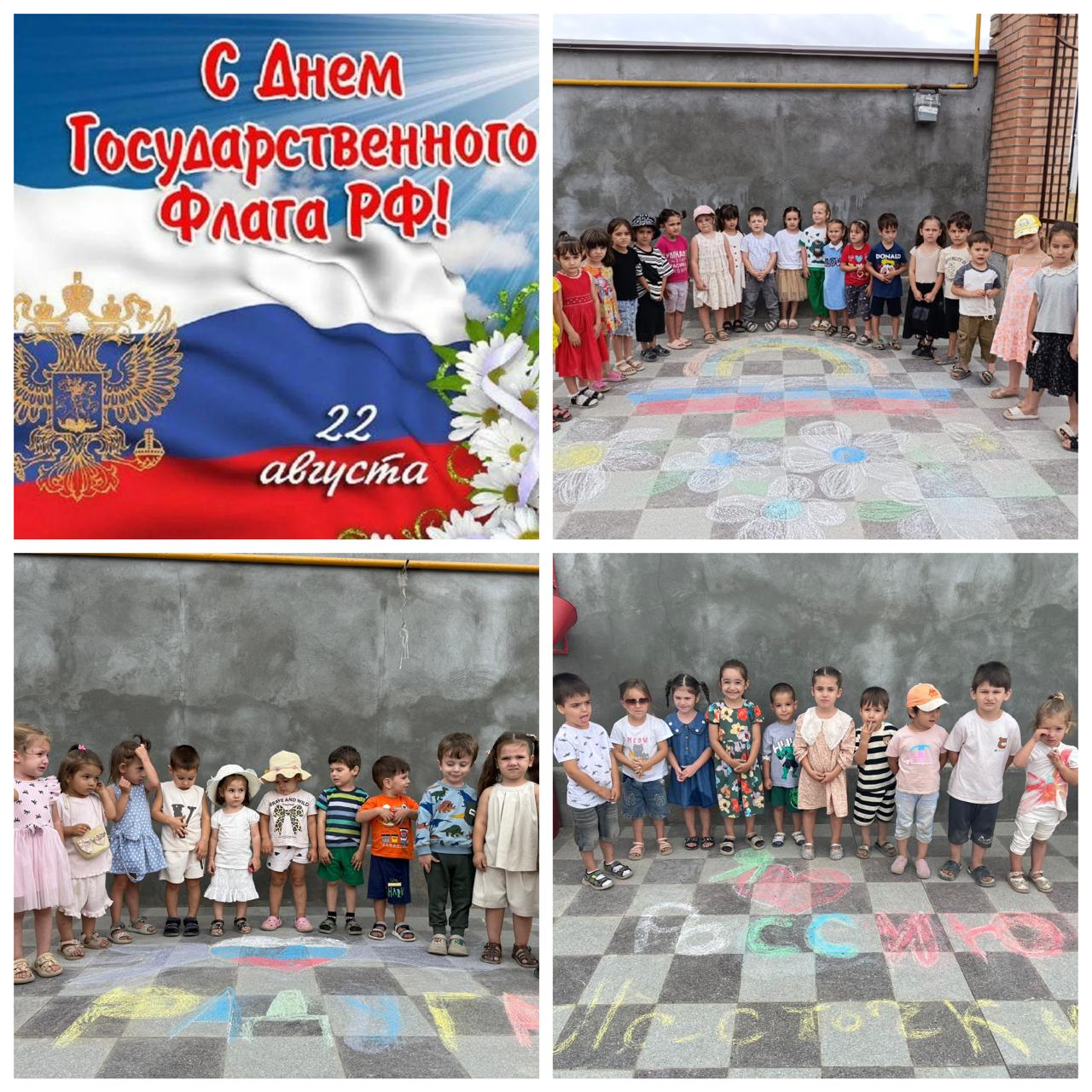 20 августа была проведена предварительная работа, где детей знакомили с государственными символами России, беседовали о стране и смотрели презентацию «День Российского флага». А также была выставка рисунков на асфальте, посвященный Дню Государственного флага РФ.